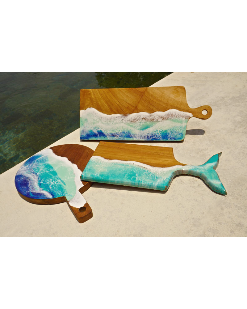 Transforme su mesa con nuestras tablas de servir, fabricadas con madera de teca de alta calidad y pintadas con inspiración marina. Cada pieza está hecha a mano por artesanos en Indonesia, combinando funcionalidad y estilo.