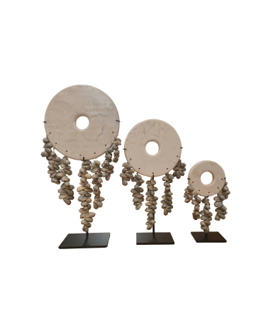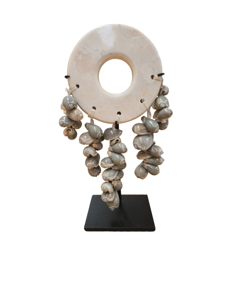Pieza artesanal única, este collar decorativo está elaborado con conchas naturales cuidadosamente seleccionadas y fijadas a un aro circular de mármol.
